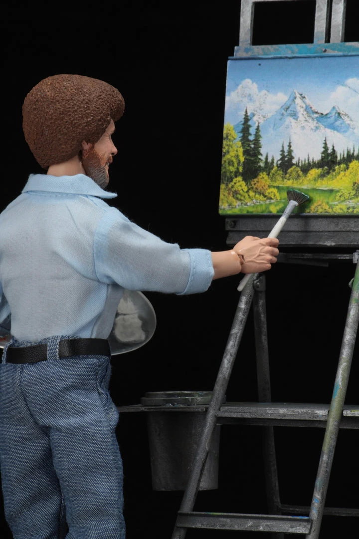Bob Ross, beloved host of the mega-popular television show The Joy of Painting, is the latest addition to NECA’s line of clothed action figures. Millions of people around the world are familiar with his soothing voice and amazing ability to bring beautiful scenes to life from blank canvas to completion in each half-hour episode.