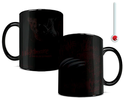 Keep yourself awake, and out of the realm of Freddy Krueger, with this Morphing Mugs heat-sensitive mug. This collectible mug features an officially licensed image collage of Freddy. The exterior of this mug transforms from black as hot liquid is added, revealing the hidden image in full vivid colors.
