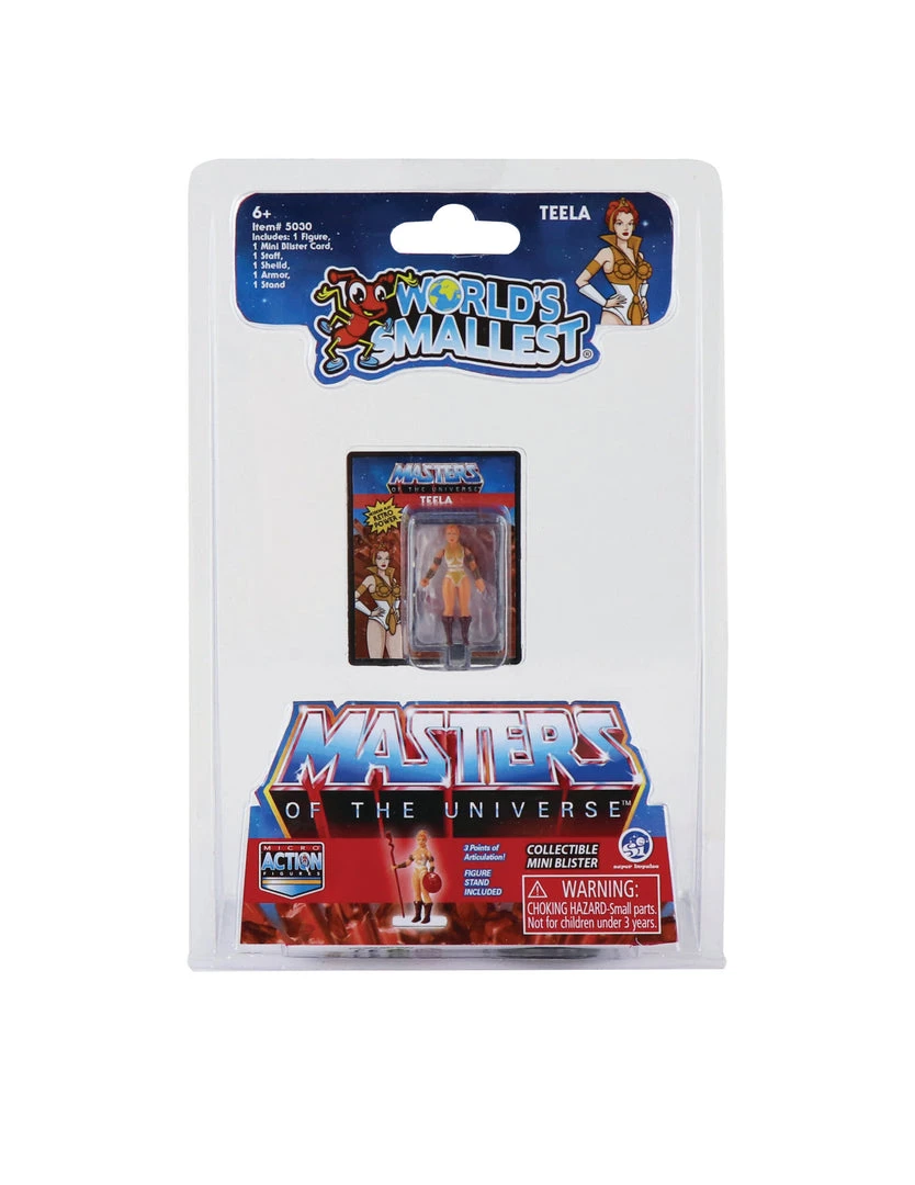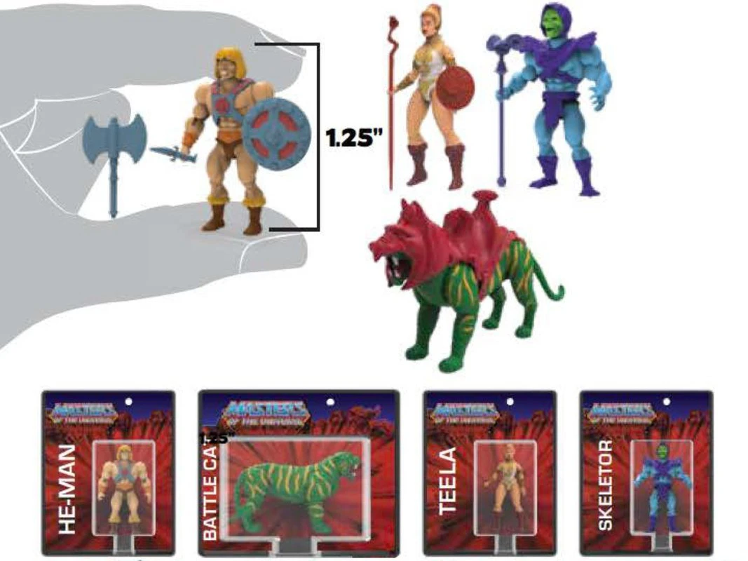 Measuring only 1.25 inches tall, each Micro Action Figure has three points of articulation, and includes a replica of the original action figure blister card, for display and storage and display stand. Collect all four retro styles He-Man, Battle Cat, Teela and Skeletor.